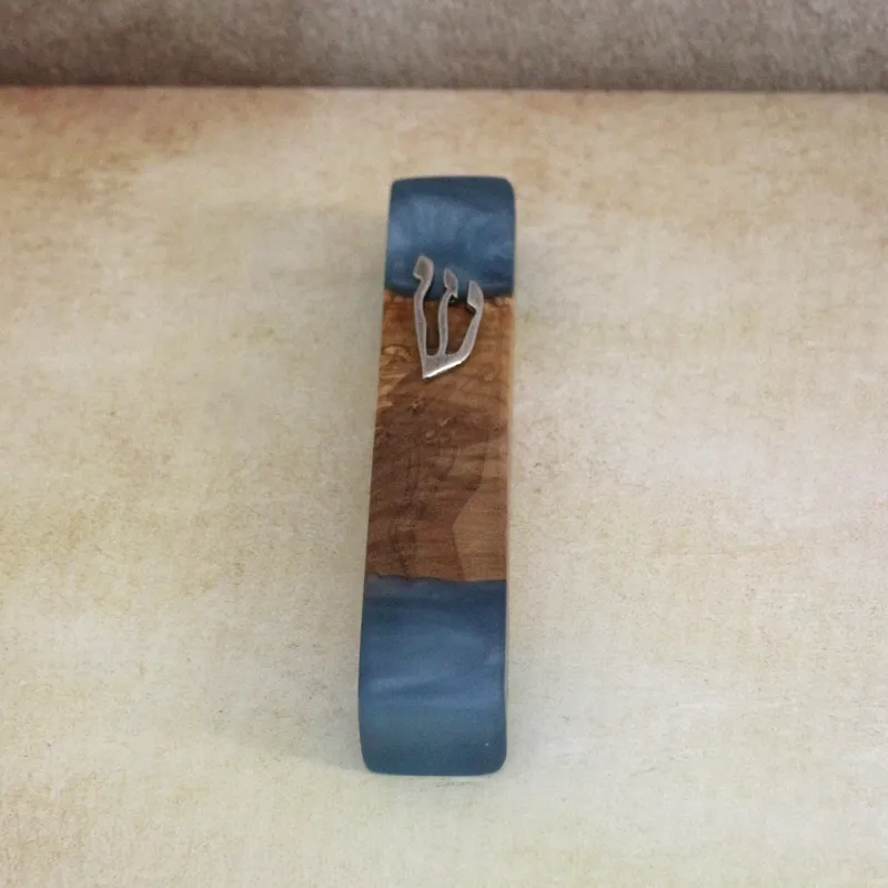 מזוזה מעץ זית ואפוקסי כחול - חיבור קדוש בין שמיים וארץ