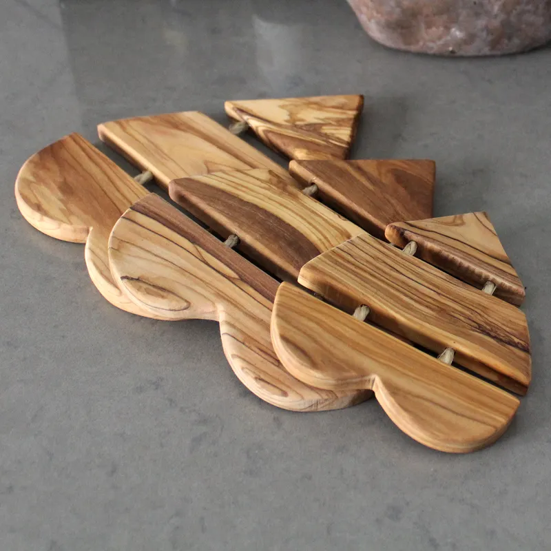כולל 3 תחתיות בגדלים שונים (19-14 ס"מ). עשויות מעץ זית חזק ועמיד, עם גוון חום עמוק ודוגמאות גרעין ייחודיות. מגנות על השולחן מחום. כל תחתית היא יצירת אמנות ייחודית. מוסיפות אלגנטיות ופונקציונליות לכל שולחן.