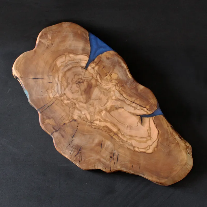 לוח הגשה אובלי מעץ זית ארץ-ישראלי עם אפוקסי כחול
