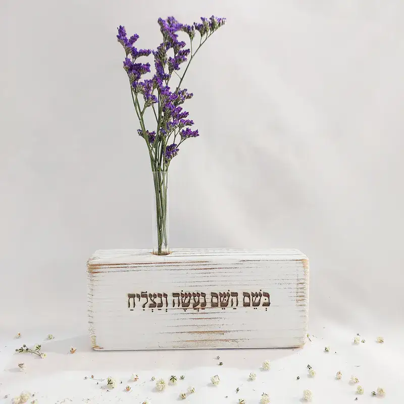 "בשם השם נעשה ונצליח" - בלוק השראה מעץ בגוון תכלת או שמנת עם חריטה אישית ומבחנת פרח - עיצוב נורדי מינימליסטי - מתנה מעוצבת בעבודת יד