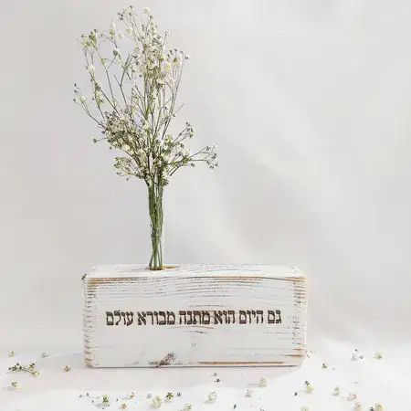 "גם היום הוא מתנה מבורא עולם" - בלוק השראה מעץ בגוון תכלת או שמנת עם חריטה אישית ומבחנת פרח - עיצוב נורדי מינימליסטי - מתנה מעוצבת בעבודת יד