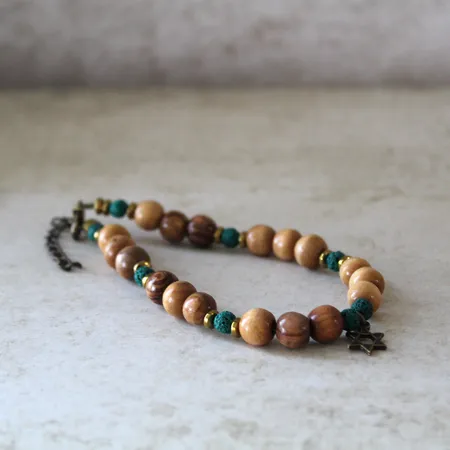 צמיד זה משלב בין חרוזי עץ זית מלוטשים בקוטר 8 מ"מ עם חרוזי לבה עדינים בגוון ירוק כהה בקוטר 4 מ"מ, כשבמרכזו מגן דוד מברונזה המוסיף נגיעה של מסורת וזהות. השילוב המיוחד בין עץ הזית העתיק, סמל השלום והשורשים, יחד עם אבני הלבה הטבעיות ומגן הדוד האלגנטי, יוצר תכשיט בעל משמעות עמוקה שמתאים לכל אירוע.