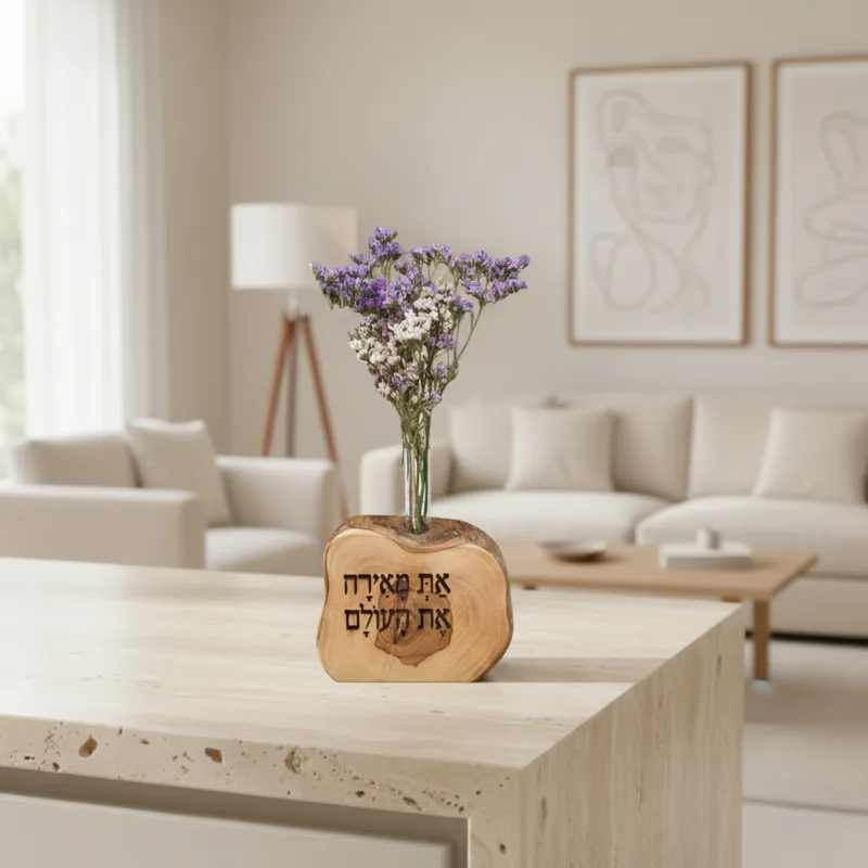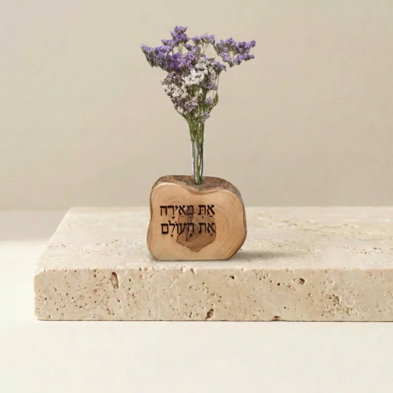 וייזבלוק עץ זית בחריטה אישית: "את מאירה את העולם" – יצירה ארצישראלית בעבודת יד עם פרחים טבעיים