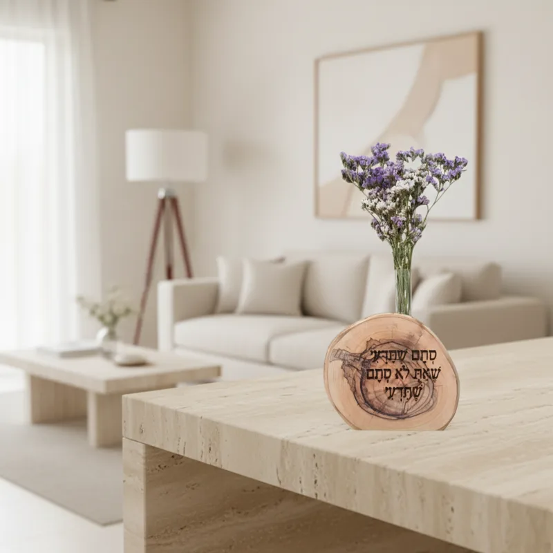 וייזבלוק עץ זית עם מסר שנון ומעצים, המגיע מעוטר בפרחי עדעד וגיבסנית טבעיים הנשמרים בשיא יופיים לאורך זמן ללא צורך במים או טיפול.