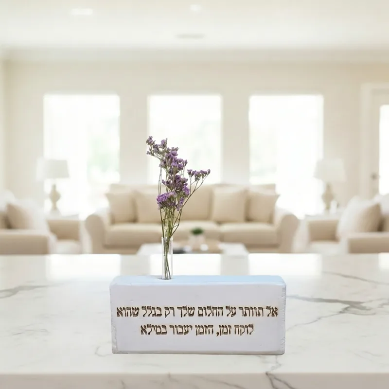 הוייזבלוק (Wiseblock) הפרחוני עם החריטה "אל תוותר על החלום שלך רק בגלל שהוא לוקח זמן, הזמן יעבור במילא" הוא פריט דקורטיבי שנועד להזכיר לנו את הכוח שבסבלנות ובהתמדה. כל בלוק מיוצר בעבודת יד מוקפדת מעץ אורן איכותי, שעובר תהליך שיוף וצביעה בטכניקת "ווש" (Wash) ייחודית המעניקה לעץ מראה של בלוק אבן טבעי, אלגנטי ומלא נוכחות.