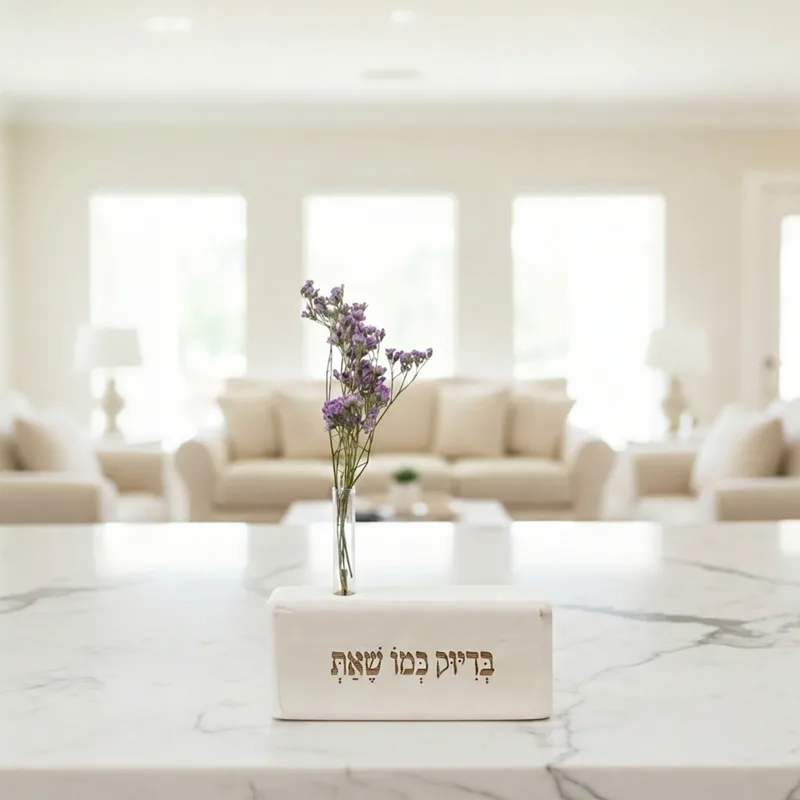 במרכז הבלוק משולבת מבחנה ובה פרחי עדעד (בגווני סגול ולבן) ו או גיפסנית לבנה. הקסם של הפרחים הללו טמון בעמידותם המופלאה – הם שומרים על מראם הטבעי והחיוני למשך חודשים ארוכים מאוד ללא צורך במים, השקיה או תחזוקה. פריט טבעי שנשאר יפהפה ומרגש לאורך זמן.