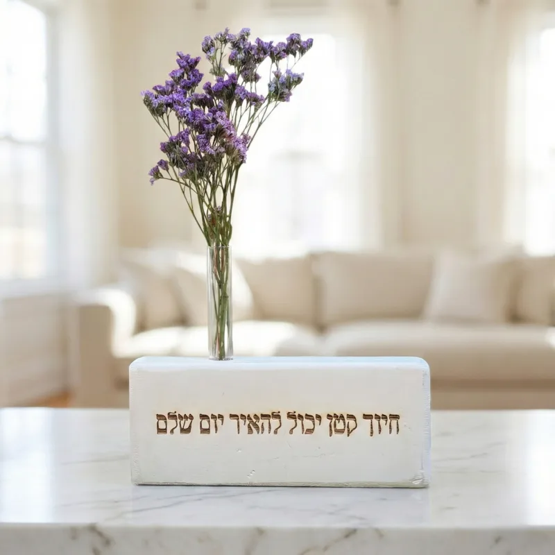 מתנה קטנה עם השפעה גדולה על מצב הרוח. בלוק עץ אורן בגימור דמוי אבן המשלב חריטה אופטימית ומבחנה עם פרחים טבעיים שנשמרים חודשים ארוכים ללא צורך בטיפול. פריט עיצובי שמוסיף נגיעה של טבע וחיוביות לכל שולחן עבודה או מדף בבית.