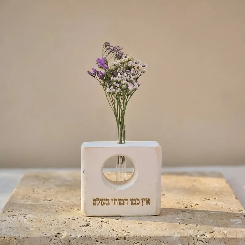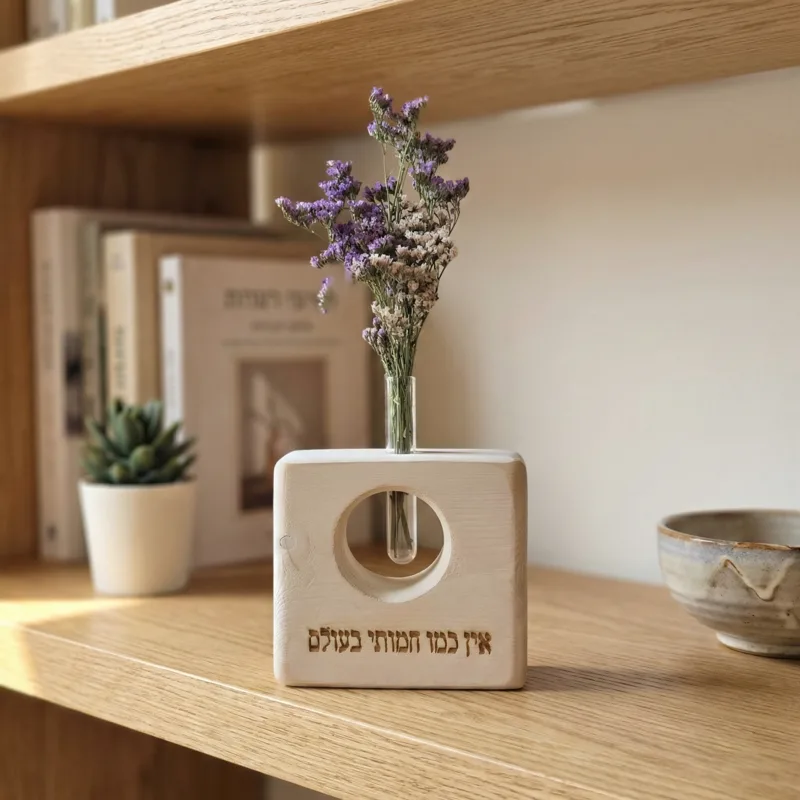 הדרך הכי יפה להגיד תודה לחמות שתמיד דואגת ומפנקת. וייזבלוק מרובע בעבודת יד המשלב חריטה מלאת אהבה עם "חלון" עגול החושף מבחנה ובה פרחים טבעיים שנשמרים חודשים ארוכים ללא צורך בטיפול. פריט עיצובי שמוסיף חום, טבע והכרת תודה לבית שלה.