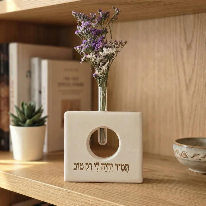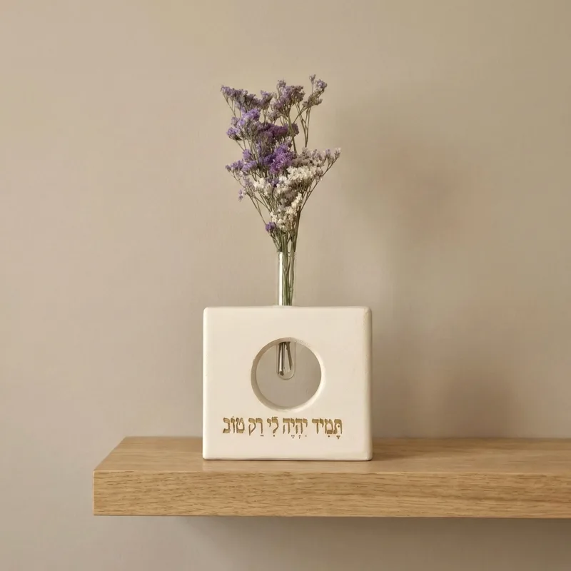 הצהרת כוונות מעצימה שהופכת לפריט דקורטיבי שובה לב. ה-Wiseblock Square משלב עץ אורן בגימור דמוי אבן עם "חלון" עגול ייחודי וחריטה של מנטרה חיובית, בתוספת פרחים טבעיים שנשמרים לאורך זמן ללא טיפול. מתנה של אמונה, תקווה ואנרגיה טובה לכל חלל.