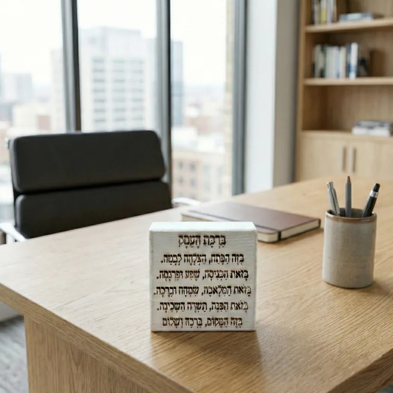 ברכת העסק מעוצבת על בלוק עץ במראה אבן – דקורציה יוקרתית למשרד ומתנה לעסק חדש בעבודת יד