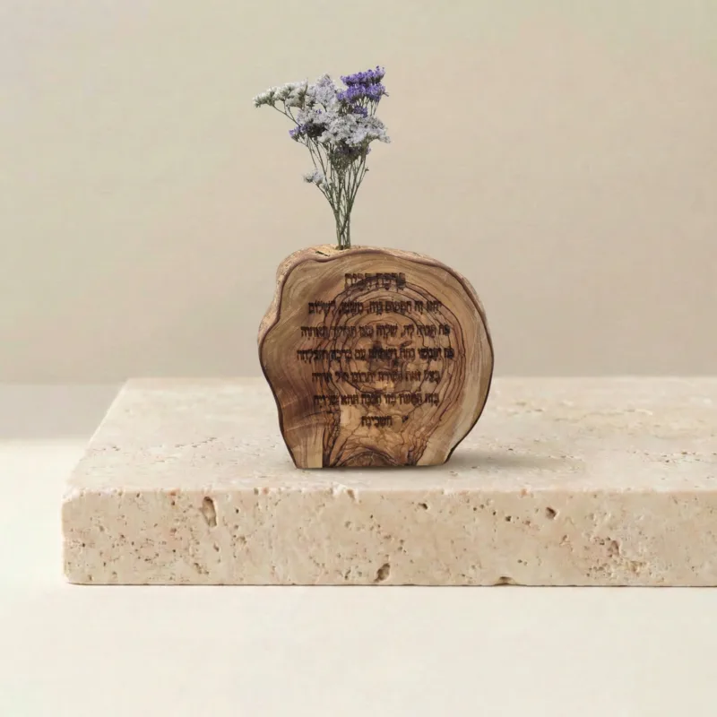 הכניסו אנרגיה של ברכה ושלווה עם יצירה מקורית המשלבת פרוסת עץ זית עתיקה ומבחנת פרחים מיובשים. עיצוב ה-"Free Style" שומר על הקווים הטבעיים של העץ, מה שהופך כל פריט ליחיד במינו בעולם. מתנה יוקרתית עם חיבור עמוק לאדמת ארץ ישראל.